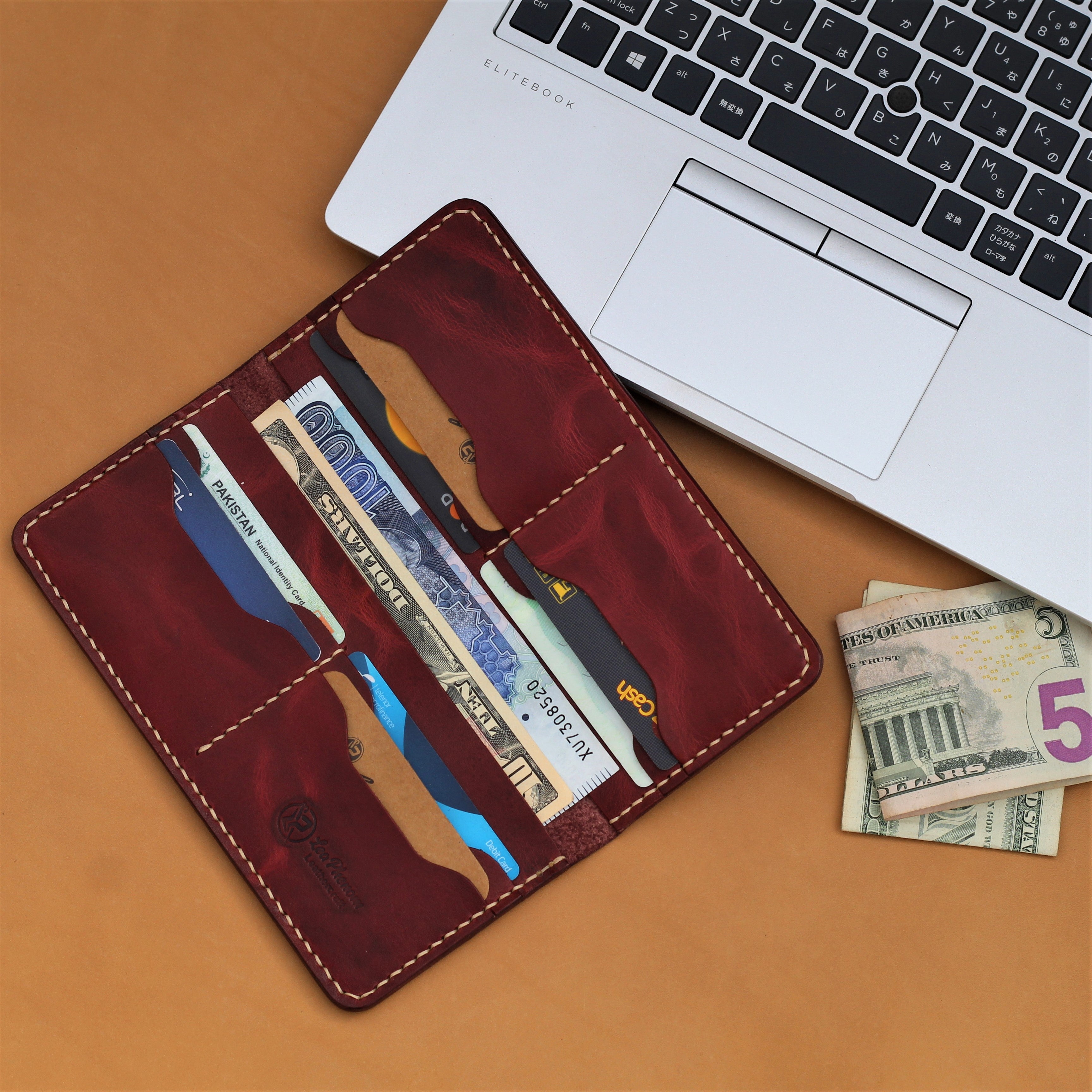This is a vertical card wallet with a unique design, to carry cards. It is made from pullup cow leather. This leather is avalible in Two colors: Dark Tan, and Black. It is stitched with durable imported nylon-waxed thread. The wallet is further polished to give it a beautiful shiny look.